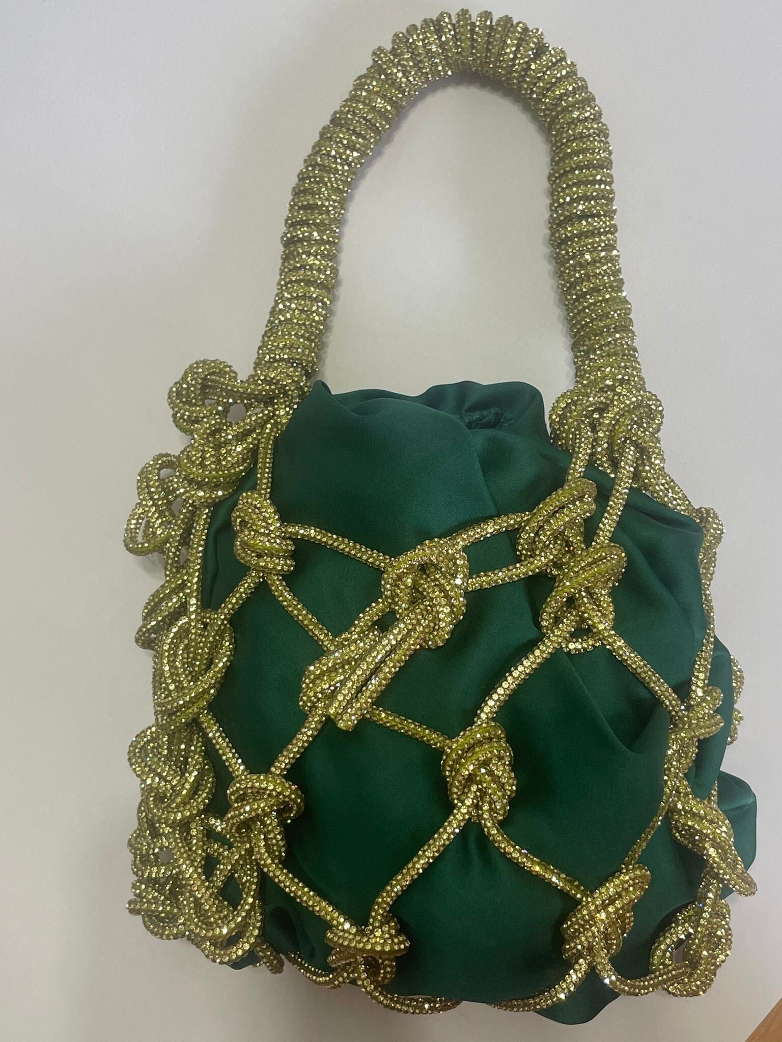 Borsetta realizzata con cordoncino macramé in cristalli, sacchetto rivestimento interno in tessuto con chiusura elastica.