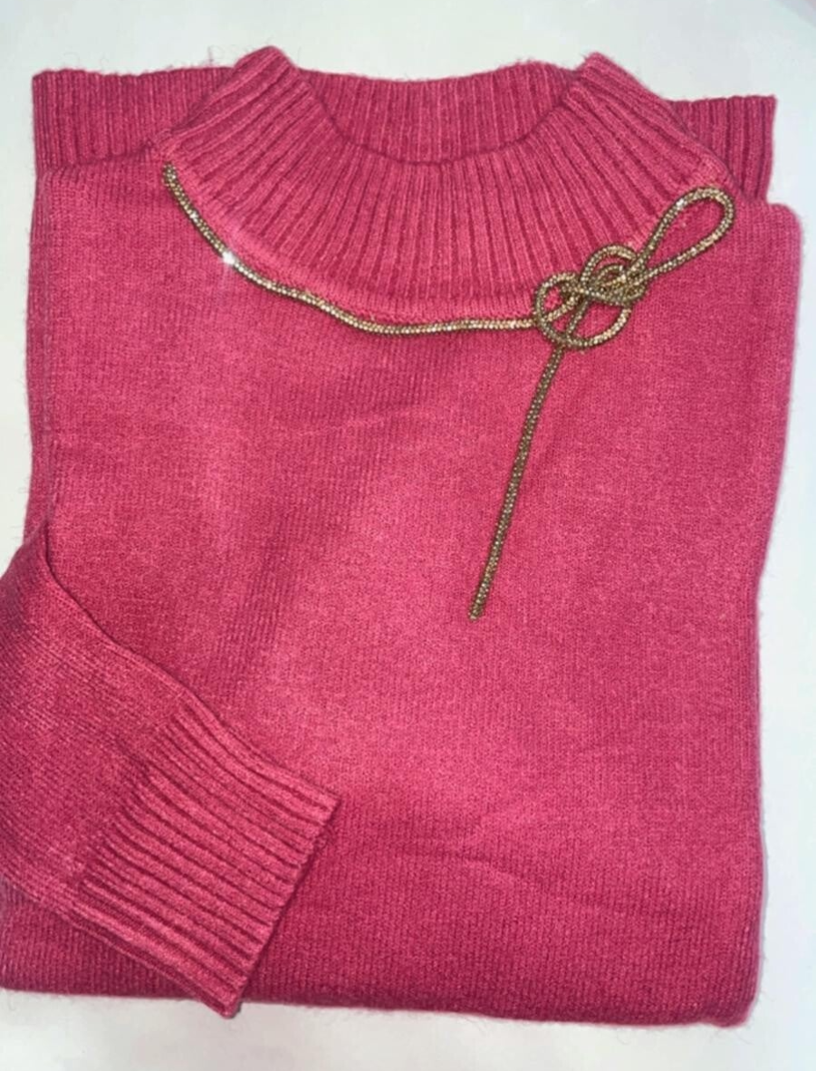 Pullover donna in mezzo collo con manica lunga;applicazione gioiello a forma di nodo in macramè strass allo scollo.
