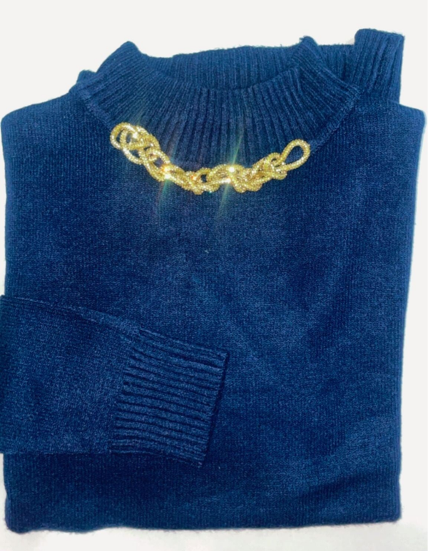Pullover donna in mezzo collo con manica lunga;applicazione gioiello a forma di catena in macramè strass allo scollo.
